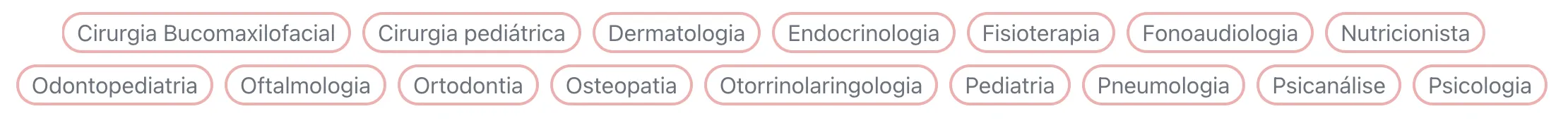 O consultório reúne inúmeros especialistas de diferentes especialidades desde Dermatologia, Pneumologia, Cirurgia Pediátrica, Fonoaudiologia, Nutricionista, Fisioterapia, Endocrinologia e muitos outros.